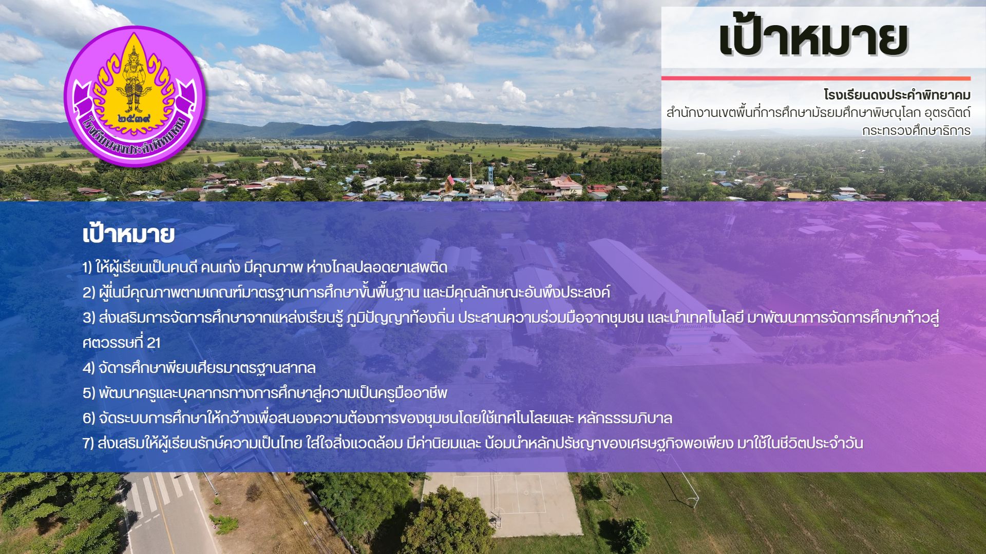 7) ส่งเสริมให้ผู้เรียนรักษ์ความเป็นไทย ใส่ใจสิ่งแวดล้อม มีค่านิยมและ น้อมนําหลักปรัชญาของเศรษฐกิจพอเพียง มาใช้ในชีวิตประจําวัน |